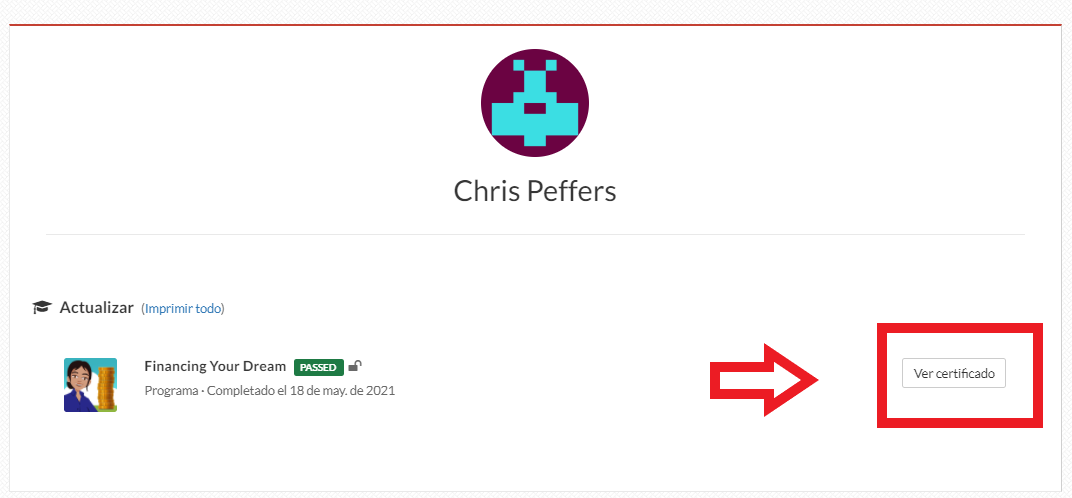 Si un alumno ha completado el programa DreamBuilder o el programa "Financiando su sueño", podrá ver y/o descargar su certificado haciendo clic en el botón 'Ver certificado'.